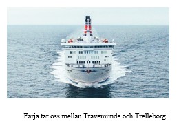 Dag 9; Efter frukost startar färden norrut mot norra Tyskland. Vi stannar utmed vägen för egen lunch och når sen eftermiddag fram till Travemünde. Vi äter gemensam middag på båten och installerar oss för natten på färjan som tar oss till Trelleborg med avgång kl. 22:00. Transport ca. 58 mil.