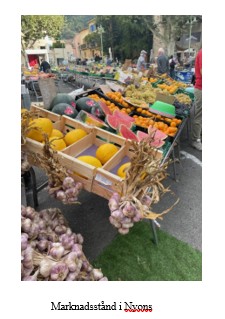 Dag 5; Idag är det lokal marknad i Nyons, något som man har här varje torsdag. Här kan lokalborna göra sina veckoinköp och utbudet är stort. Kanske gör du ett spännande inköp för att ta hem till Sverige. Lunch intas på egen hand i staden. På eftermiddagen tar bussen oss till den lilla byn Curnier där vi besöker Lena i hennes hus. Byn har medeltida charm och Lenas hus är beläget mitt i byn alldeles invid byns gemensamma brunn. Alldeles utanför byn ligger "Plätten" som Lena kallar sin trädgård. Här umgås vi och har trevligt med lite tilltugg och vin. I byn finns en liten restaurang där vi intar det som huset har att erbjuda. Bussen tar oss sedan tillbaka till hotellet i Nyons. Transport ca. 3 mil.