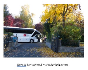 Dag 10; Efter frukost på färjan startar färden i Sverige mot Stockholm. Ni som bor utmed färdvägen till Stockholm kliver av bussen efterhand, och ni andra bör vara framme på Stockholms central vid niotiden på kvällen. Transport ca. 65 mil.